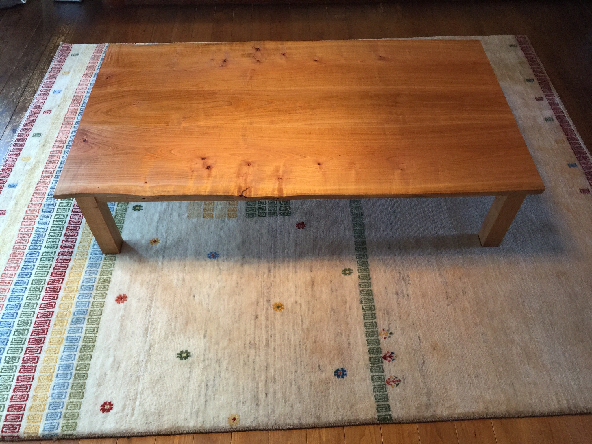 こちらは、山桜材で製作したこたつ。 こちらは、先日納品させていただいたものです。 山桜材の耳付き無垢材で オーダーいただき、 w1500のサイズで製作いたしました。 この こたつの下に、ギャッベを合わせたいと、 ギャッベ展にお越しいただき、 明るい色合いの240㎝の ギャッベを選ばれましたよ。 お部屋の雰囲気も 明るくなりますね。 冬はこたつ布団をはさんで、 あったか、快適に過ごせますね。 ありがとうございます。