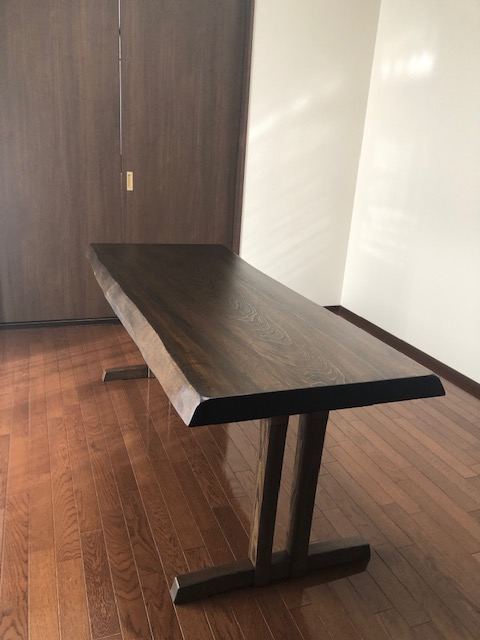 一宮市 K様邸 脚の作り替え:楢 ダークブラウン系色オイル仕上げ 帆立脚 サイズ:天板までの高さ 700 約17年前にご購入いただきました、一枚板の座卓の脚を ダイニングテーブルサイズに作り替えました。 天板の色と合うように、色付きのオイルを調色し仕上げてあります。 お部屋の雰囲気にもぴったり合いました。 すえひろでは、作り替えの依頼も承っております。 オイル仕上げの無垢の家具だからこそできる技です。 脚のカットや作り替え、天板のカットなどお気軽にご相談ください(^^)
