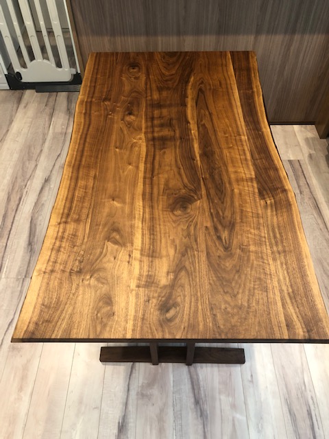 ダイニングテーブル:ウォールナット 耳付き5枚接ぎ オイル仕上げ 棚付帆立脚