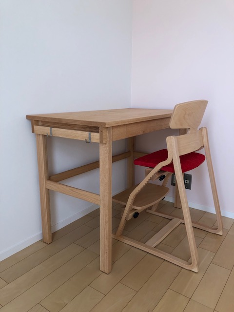 ナラ材を使ったオイル仕上げの学習デスクです。鍵付きの幅広の抽斗が付いています。
