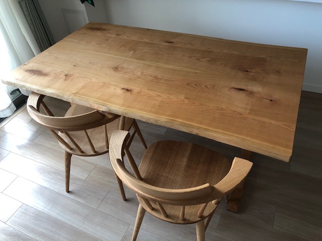 一宮市 T様邸 ダイニングテーブル:山桜 耳付き4枚接ぎ ブックマッチ オイル仕上げ サイズ:W1500 × D840程 × H700 耳付きの山桜を使った4枚ブックマッチのダイニングテーブルです。 左右対称でとても美しい表情です。節の出方も独特ですてきですね。 貫は一枚板+楔留めタイプです。ティッシュやリモコンなど、ちょっとした物を置くのに最適です。 すえひろでは、国産の山桜を使った家具を多数取扱っております。 フルオーダーも可能ですので、お気軽にお問い合わせください(^^)