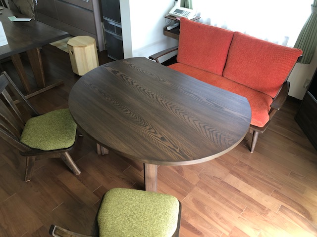タモ材を数枚接ぎ合わせ、変形楕円型に加工したダイニングテーブルです。