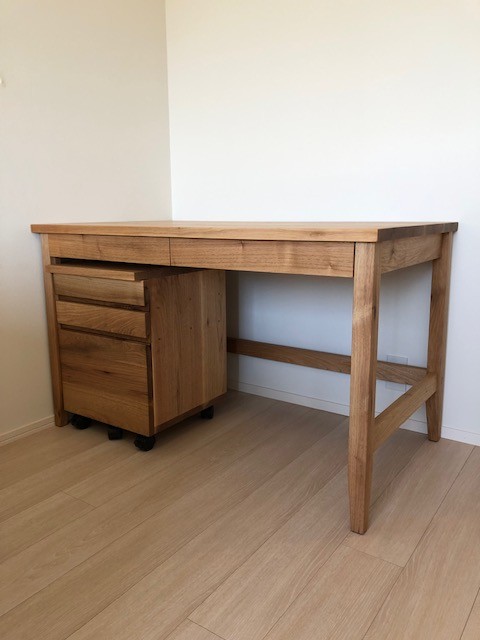 一宮市 G様邸 学習デスク:胡桃 抽斗2杯 可動式ワゴン オイル仕上げ デスク:W1200 × D700 × H720 ワゴン:W410 × D460 × H570 くるみ材を使ったシンプルデザインの学習デスクです。 胡桃独特の木目が美しいですね キャスター付きのワゴンは抽斗収納が3段ついています。 最下段は重さに耐えれるようスライドレール付きです。 取り外し可能な仕切りも便利ですね。 デスク本体にも抽斗が2杯ついています。大容量で使いやすいデスクです。 すえひろでは無垢材を使った学習デスクを取り扱っております。 サイズオーダーも可能ですのでお気軽にご相談ください(^^)