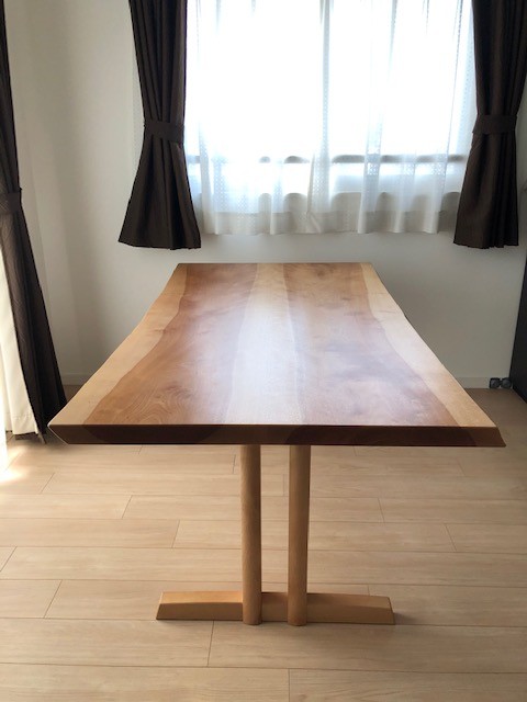 一宮市 F様邸 ダイニングテーブル:水目桜 耳付きブックマッチ オイル仕上げ サイズ:W1600 × 900 × H700 岐阜県産の希少な水目桜を使った耳付きブックマッチのダイニングテーブルです。 赤身と白太のバランスが絶妙で、職人さんのセンスが光りますね☆ 水目らしいキラキラとした表情も美しいです。 脚はすっきりとした帆立脚タイプで、椅子の立ち座りも楽々できます。 すえひろでは、希少な国産材を使ったダイニングテーブルを扱っております。 サイズや細やかなオーダーも可能ですので、お気軽にご相談ください(^^)
