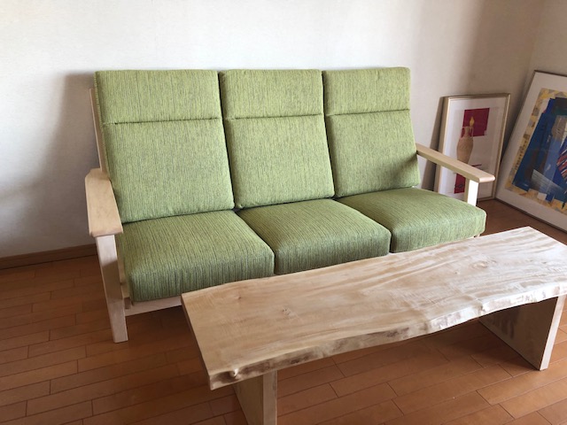 白色がとてもきれいなメープル材を使った3人掛けのリビングソファです。