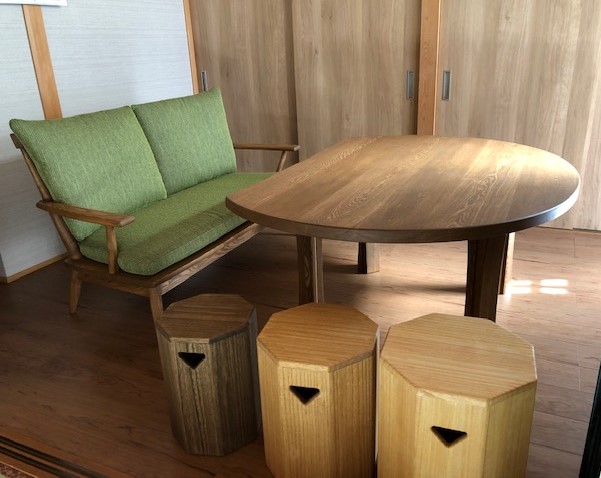 関市 I様邸 半丸ダイニングテーブル:梻(たも) ミディアムブラウン色オイル仕上げ サイズ:W1500 × D1100 × H620 たも材を使った半丸型のダイニングテーブルです。高さは通常より低めの62㎝です タモらしい力強い木目とミディアムブラウン色がかっこいいですね。 ソファも同じミディアムブラウン色で仕上げたので統一感がありますね。 3色展開の入れ子スツールもお選びいただきました。 すえひろでは、国産材を使った家具を多数製作しております。 オーダーも可能ですので、お気軽にご相談ください(^^)