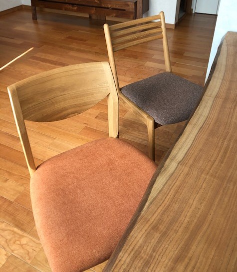 一宮市 F様邸 ダイニングテーブル:胡桃 耳付き3枚接ぎ オイル仕上げ サイズ:W1500 × D920 × H700 T41 耳付きのくるみ材を使った3枚接ぎのダイニングテーブルです。 耳の動きやくるみらしい木目がとても美しいですね。 椅子は4脚全て違う種類をお選びいただきました。 全て布座で、色もそれぞれ4色お選びいただきました。 すごく可愛らしくおしゃれな空間になりましたね♪ すえひろでは、国産材を使用した家具を多数製作しております。 オーダーも可能ですのでお気軽にご相談ください(^^)