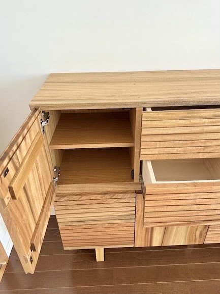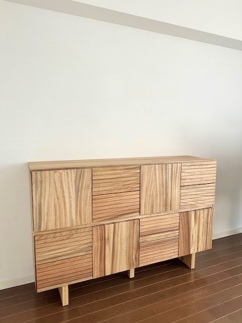 楠(くす)の木のサイドボードを納めさせていただきました。 楠の木目はおおらかで表情豊か。 そして扉を開けた瞬間にふわりと立ちのぼる楠ならではの清々しい香り。 深呼吸したくなるようなその香りは、空間を静かに整えてくれます。 使うほどに色味が深まり、時間とともに暮らしに寄り添っていく無垢材の魅力 収納としての役割はもちろん、 置かれているだけで部屋の空気感まで変えてくれる そんなサイドボードです。 これからの毎日の中で、木の香りや手触りを楽しみながら、 少しずつその家だけの表情に育ってゆきますように。