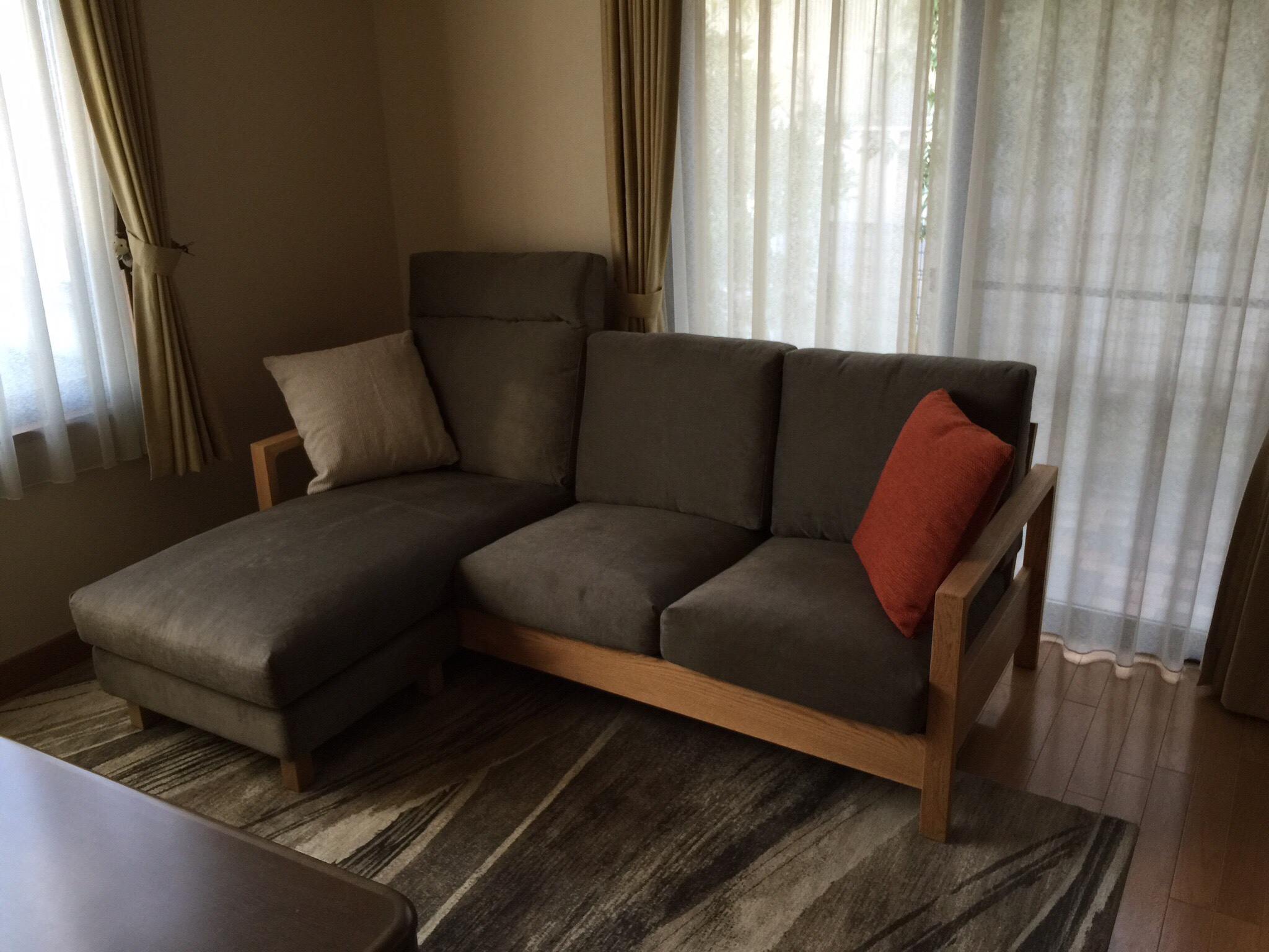 ゆったりした座り心地のソファー。グリーンの組み合わせも合いますね。